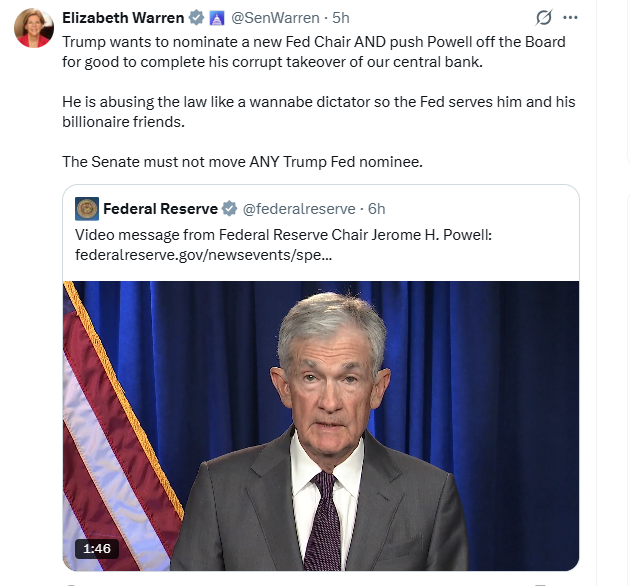 Senate Democrats view the investigation as a hostile takeover. Senator Elizabeth Warren (D-MA) argued the administration is abusing the law to force the central bank to serve political allies. She urged the Senate to block any potential replacement if the administration removes Powell before his term ends in May 2026.