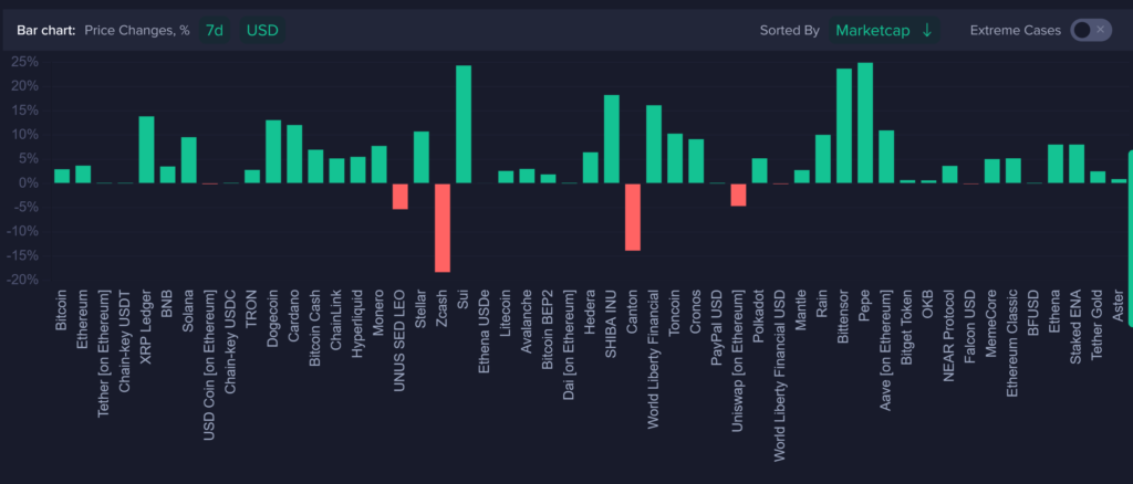 Dogecoin gained 13.1% as meme-coin volatility returned. The 21Shares 2x Long Dogecoin ETF emerged as a top performer.